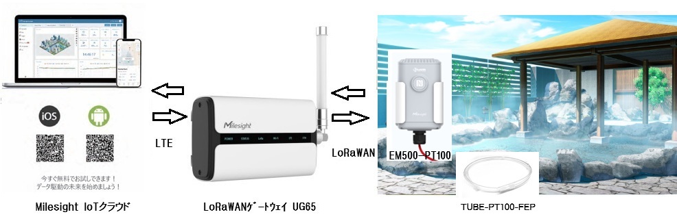 LoRaWANの特長 ・消費電力が少ない LoRaWANの1つ目の特徴は、「消費電力が少ない」という点です。LoRaWANは、エンドデバイスにより消費電力が多少異なりますが、送受信速度が早く、ほかの通信規格に比べて消費電力が少ないため、メンテナンス回数も抑えることができます。また、ボタン電池1つの電力で双方向通信ができるほど消費電力が少なく、そのバッテリーは、連続稼働をしても10年間以上は稼働することができるとも言われています。 ・長距離通信ができる LoRaWANの2つ目の特徴は、「長距離通信ができる」という点です。スマートフォン(3G以降)などで利用されている800MHz帯で届く距離は、約2~5kmと言われますが、LoRaWANでは、約10kmと倍以上の距離に通信することが可能です。このように、障害物がほとんどないような場所では、10km以上の通信をすることが可能ですが、業務に利用する場合、市街地であれば約3〜5km、障害物がある屋内などの場合であれば、約1kmと想定しておくと良いでしょう。 ・ノイズに強く通信が安定する LoRaWANの3つ目の特徴は、「ノイズに強く通信が安定する」という点です。LoRaWANが利用している920MHz帯は、他の無線ネットワークが存在している環境下でも、電波同時の干渉が起きにくく、通信の遅延時間(レイテンシ)を抑え、安定的に通信を行なうことが可能です。そのため、工場施設内や屋内でも、安心して活用することができます。 LoRaWAN温度センサー Milesight EM500-PT100の特長 ・耐食性ケーブルと複数のプローブ ・高精度のための 3 線式接続 ・見通し距離10kmまでの超長距離伝送 ・過酷な環境用途向けの IP67 防水筐体 ・内蔵の 19000 mAh 交換可能なバッテリーと 10 年間動作交換なし ・NFC(近距離無線通信)搭載で設定が簡単 ・標準の LoRaWAN ゲートウェイおよびネットワークに準拠サーバー ・Milesight IoT Cloud ソリューションによる迅速かつ簡単な管理 ・柱、壁、DINレールへの取り付け 温度センサー保護チューブ TUBU-PT100-FEPの特長 ・フッ素樹脂FEPチューブ ・過酷な環境での使用できる耐薬品性 ・-200℃から+200℃までの熱安定性 ・汚れが付着しにくい非粘着性表面 ・ケーブルが見える透明性 ・信頼性の高い電気絶縁強度 ・先端封じ加工済 LoRaWANゲートウェイ Milesight UG65の特長 ・堅牢な8CH LoRaWANゲートウェイ, TELEC認証済 ・高性能クアッドコア 64-bit ARM Cortex-A53 CPU採用 ・低消費電力でトラフィック量が大きい、SX1302 LoRa チップ採用 ・マルチバックホールバックアップ(イーサネット,セイラー,Wi-Hi) ・複数VPN(IPsec/OpenVPN/L2TP/PPTP/DMVPN) ・DeviceHubとMilesight IoT Cloud が提供するリモート管理 ・小型堅牢なIP65筐体(UG65)、小型堅牢なIP67筐体(UG67) ・ビルトイン ネットワーク サーバー(MQTT/HTTP/HTTPS) API ・組込Python SDK、Node-RED 開発ツール ・机上、壁、または柱への取り付け Milesight IoTクラウドの特長 ・リアルタイム及び履歴データをダッシュボード上のドラッグ&ドロップウィジェットに変換 ・アクセスと監視プロジェクトをどこからでも制御 ・トリガーされたイベントに基ずく電子メール及びモバイルプッシュ通知 ・AWS上に構築され、データの機密性と信頼性の高いインフラストラクチャーを提供 ・2 ダッシュボード、10 デバイスまで無料提供 |